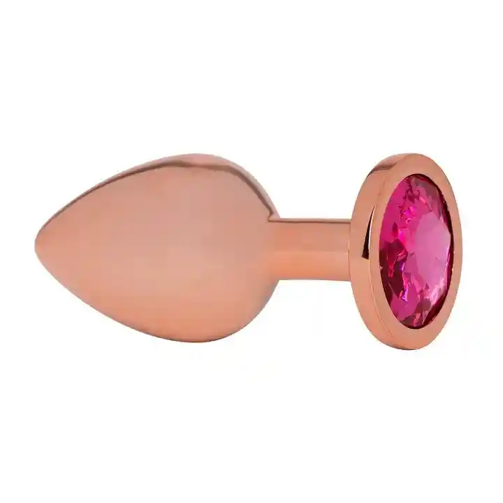 Plug anal metálico con joya decorativa en la base. Características: Material: Acero (plug) Largo total: 8.2 cm Largo insertable del plug: 7.5 cm Color del plug: oro rosa Color de la joya: Rosado Diámetro: 3.4 cms. Peso: 89 gr
