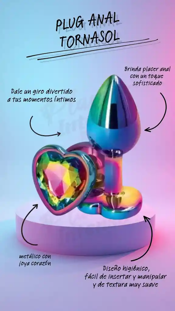Descubre una nueva dimensión de placer con este elegante plug anal adornado con una joya en forma de corazón y colores deslumbrantes. Su diseño higiénico y textura ultra suave lo hacen fácil de insertar y manipular, asegurando una experiencia cómoda y agradable. Fabricado en resistente acero quirúrgico inoxidable, este juguete es perfecto para quienes buscan añadir un toque de sofisticación a sus momentos íntimos. Además, juega con la temperatura para ofrecer sensaciones únicas y estimulantes. CARACTERÍSTICAS: Material: Acero Largo: 7 cm Ancho: 2.7 cm Resistente al agua Así que, si estás listo para llevar tus aventuras a otro nivel, este plug con joya de corazón es el accesorio ideal para enriquecer tu vida sexual con un toque de corazon anal irresistible.