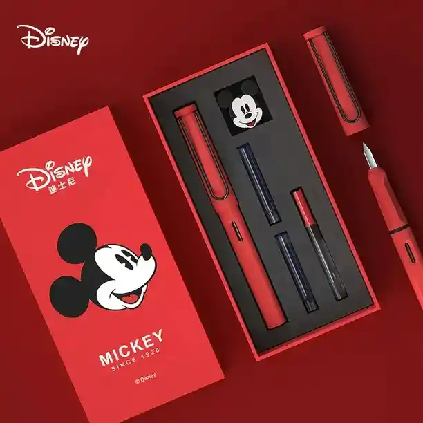 Pluma estilografo micky mouse. contenido, pluma, bomba, 2 repuestos de cartucho y frasco de tinta 15ml