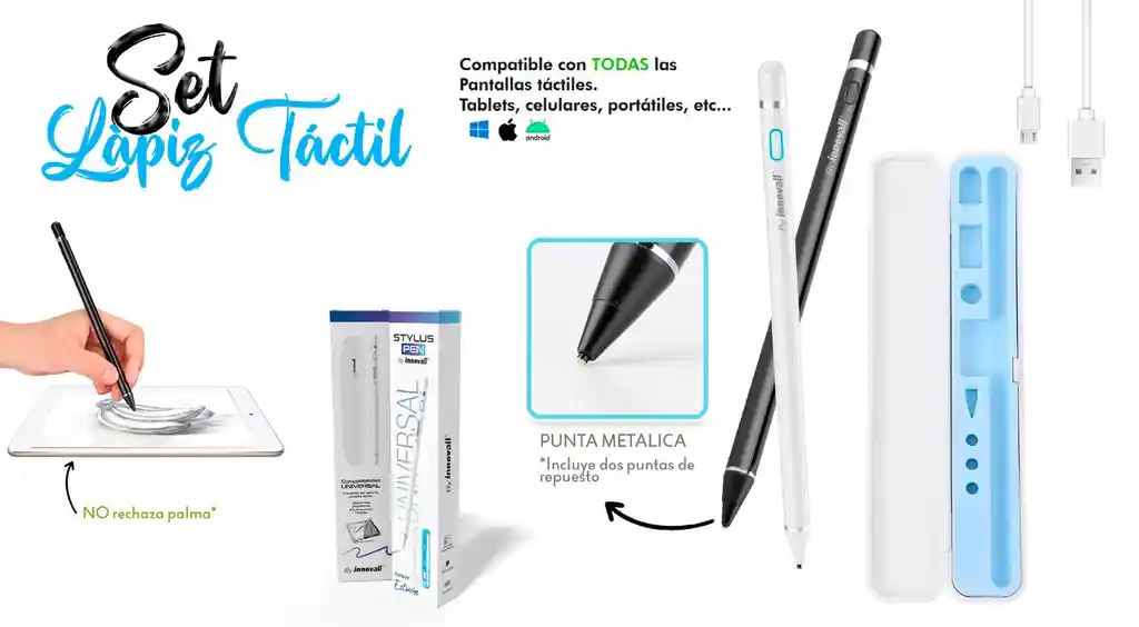 El lápiz Stylus Pen para iOS y Android es un accesorio que te permite dibujar, escribir y hacer anotaciones en la pantalla del dispositivo con precisión y sensibilidad a la presión. Sensibilidad a la presión: el lápiz es sensible a la presión, lo que significa que puede detectar la cantidad de presión que aplicas en la punta del lápiz. Esto te permite dibujar líneas más gruesas o más finas según la presión que apliques. Diseño ergonómico: el lápiz ha sido diseñado para que sea cómodo de sostener y usar durante largos períodos de tiempo, gracias a su forma ergonómica. Recargable: tiene una batería interna recargable, lo que significa que puedes usarla durante horas antes de tener que recargarla. Compatibilidad con : este lápiz táctil es compatible con una amplia gama de aplicaciones de dibujo y anotación, lo que te permite usarlo con tus aplicaciones favoritas. Precisión de píxeles: con tecnología avanzada, el lápiz puede localizar con precisión cada píxel. Rechazo con la palma de la mano: puedes usar el bolígrafo como un lápiz real, como si estuviera sobre papel, incluso si colocas la palma de la mano sobre la pantalla. CARACTERISTICAS: Punta metalica de alta precision, sencible al toque y sin retrasos. Recargable por USB, con bateria de larga duración Incluye estuche rigido de transporte, cable de carga y puntas de repuesto.