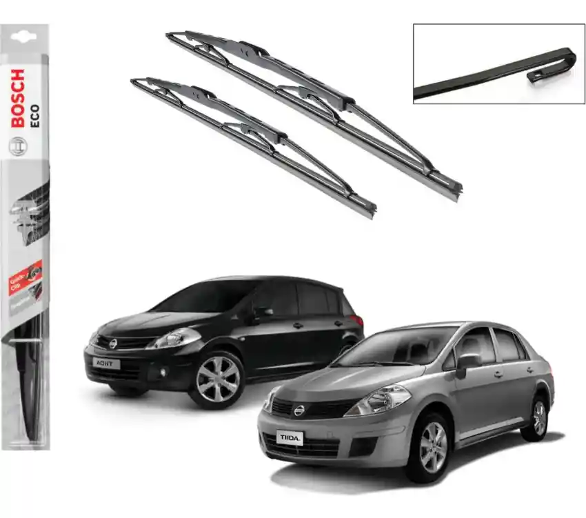 Par Plumillas Bosch Metalica Nissan Tiida 2006 - 2016 - Estructura unica que asegura un barrido optimo - Diseño metalico. - Sencilla Instalacion gracias a sus adaptadores originales. El precio incluye 2 plumillas BOSCH ECO (24" Y 14") con 2 pines intercambiables de acuerdo a la necesidad de su vehiculo Las plumillas son originales, contramarcadas BOSCH y vienen en empaque sellado por unidad. VER INSTRUCCIONES AL RESPALDO DEL EMPAQUE PARA FACILITAR INSTALACION.