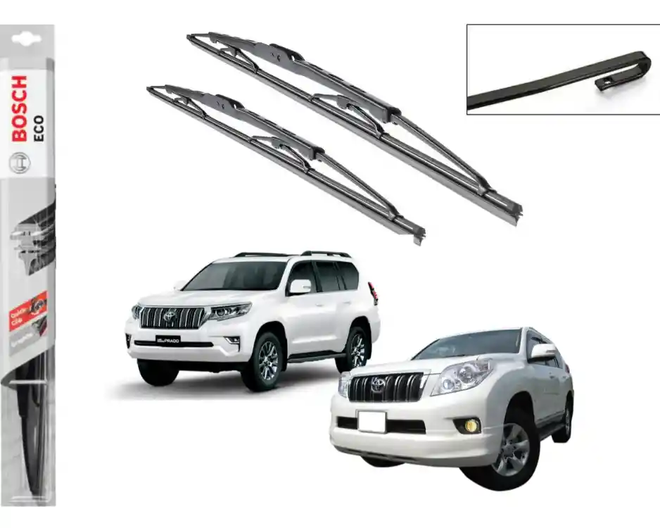 Somos Comercializadora AJC Lujos y accesorios para su auto. PLUMILLA METALICA BOSCH ECO 20" Y 26" PARA TOYOTA PRADO 2011 AL 2023. - Estructura unica que asegura un barrido optimo - Diseño metalico. - Sencilla Instalacion gracias a sus adaptadores originales. El precio incluye 2 plumillas BOSCH ECO (20" Y 26") de acuerdo a la necesidad de su vehiculo Las plumillas son originales, contramarcadas BOSCH y vienen en empaque sellado por unidad. VER INSTRUCCIONES AL RESPALDO DEL EMPAQUE PARA FACILITAR INSTALACION. Garantía del vendedor: 30 días