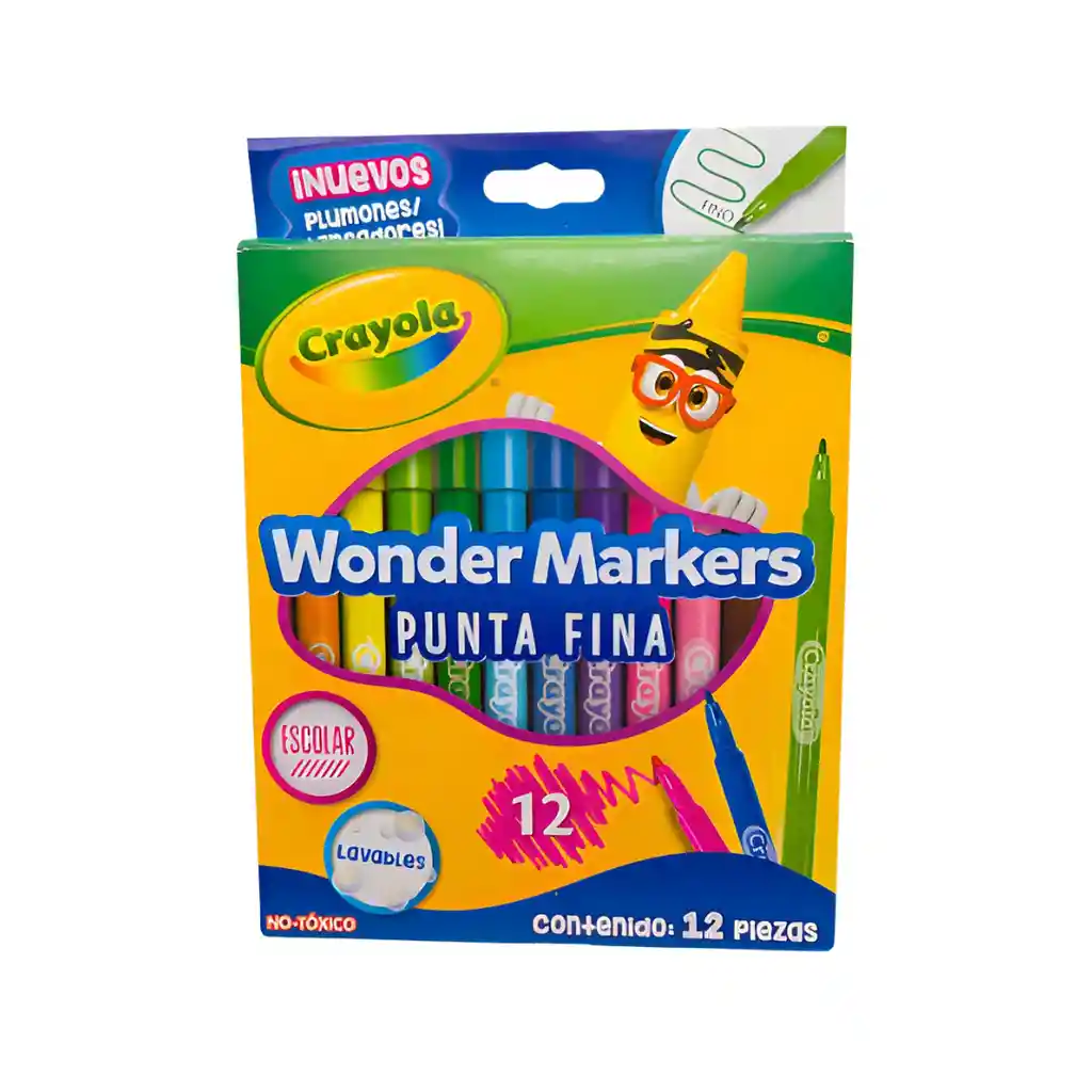 "¡Dibuja, escribe y colorea con total precisión! Los Wonder Markers Punta Fina Crayola son perfectos para realizar trazos detallados, escribir con estilo o llenar de color tus proyectos escolares y artísticos. Su punta fina ofrece un control exacto, ideal para delinear o trabajar en espacios pequeños sin manchar. Además, cuentan con una fórmula lavable y no tóxica, por lo que las manchas se eliminan fácilmente de la piel, ropa y superficies, garantizando una experiencia creativa segura para los niños."