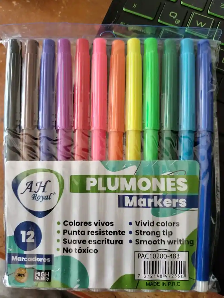 Caja de 12 marcadores, colores vivos, punta resistente, suave escritura, no toxico.