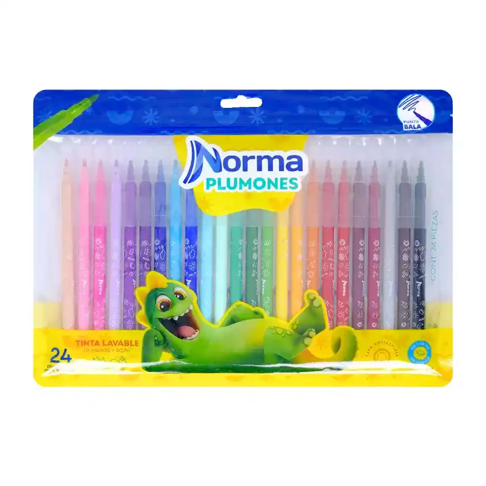 Los nuevos plumones punta bala son ideales para trazos delgados y precisos, con tinta lavable a base de agua, lo que los hace lavables de la ropa y de la piel. Además son seguros gracias su tapa anti-ahogo y a que no son tóxicos. Disfruta de sus 24 colores brillantes. DISPONIBILIDAD DE CANTIDAD SEGUN TIENDA.