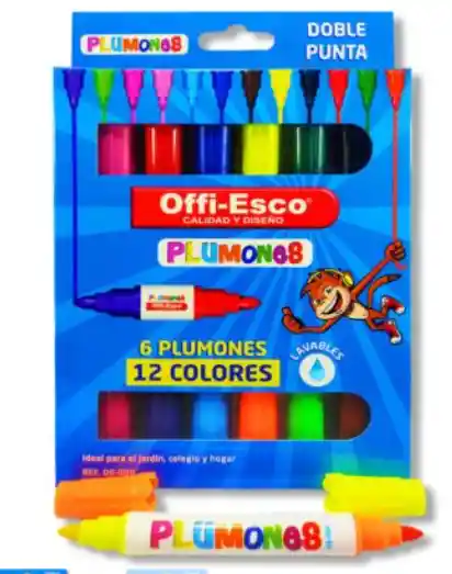 Plumones Offi-Esco x6 Doble Punta. 6 Plumones – 12 Colores. Ideal para el jardín, colegio y hogar. Ideal para dibujar, colorear y escribir. Puntas ideales para un doble trazo. Colores llamativos e intensos. Tapa antiasfixia.