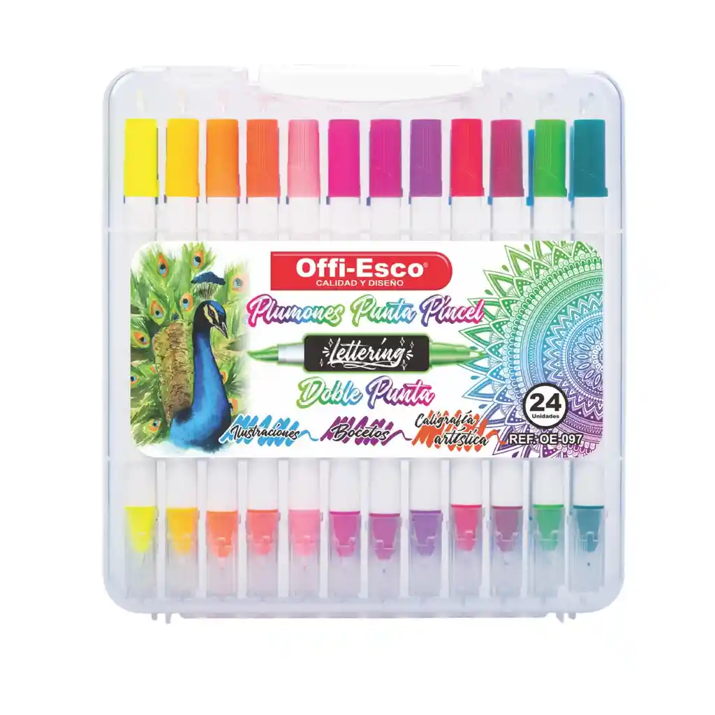 Los Plumones Punta Pincel Lettering Doble Punta Offi-Esco X24 son la herramienta ideal para quienes aman el arte del lettering, la ilustración y la creatividad en papel. Este set incluye 24 colores vibrantes y variados que permiten dar vida a todo tipo de diseños, desde trazos delicados hasta detalles intensos. Cada plumón cuenta con doble punta: una punta pincel flexible, perfecta para lograr trazos gruesos y delgados con facilidad, ideal para caligrafía y efectos artísticos; y una punta fina, diseñada para detalles precisos, contornos y escritura uniforme. Su tinta de alta calidad ofrece colores intensos, buena cobertura y secado rápido, evitando manchas y permitiendo trabajar con mayor comodidad. Además, su diseño ergonómico facilita un agarre cómodo, ideal para largas sesiones creativas. Perfectos para estudiantes, artistas, diseñadores y aficionados al lettering, estos plumones son una excelente opción para bullet journals, tarjetas, ilustraciones, apuntes creativos y proyectos DIY. Características principales: Set de 24 colores surtidos Doble punta: pincel flexible + punta fina Tinta de secado rápido Colores intensos y uniformes Ideales para lettering, dibujo y decoración ¡Exprésate con color y creatividad en cada trazo! 🎨