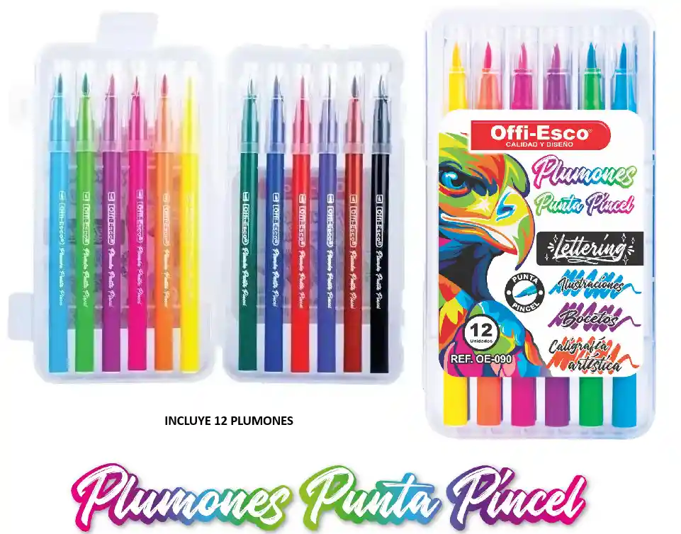 Marcadores Plumones punta tipo pincel Lettering x 12 unidades - Ideal para ilustraciones, caligrafía artística, bocetos, lettering y pintar. - Offiesco Original. - Excelente fluido y contenido de tinta. - Punta pincel de flexibilidad media. - Tapa antiasfixia. - Tinta lavable. - No toxico. EAN 7709027934888