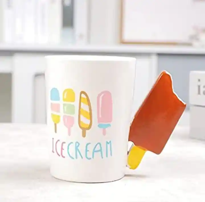 Divertida taza Diseño Helado Material: Cerámica Tiene una capacidad de 350 Ml y se presenta en un diseño en 3D decorado con dibujos de helados y asa con forma de Paleta.