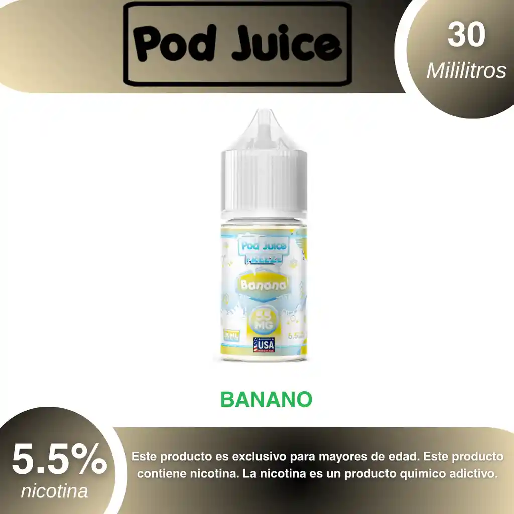 Pod Juice Sales Sabor Banano 5.5% PROHIBIDA LA VENTA A MENORES DE EDAD. ADVERTENCIA: ESTE PRODUCTO CONTIENE NICOTINA, LA NICOTINA ES UNA SUSTANCIA QUIMICA ADICTIVA Y NOCIVA PARA LA SALUD. Los líquidos para vapeo contienen: propilenglicol USP, glicerina USP, sabor artificial y nicotina. Este producto puede contener nicotina, una sustancia altamente adictiva que puede generar dependencia, posibles afectaciones arteriales, cardiacas, pulmonares y otras aun no identificadas. No se recomienda su uso a mujeres en embarazo, puede generar lesiones al feto. Mantener alejado de niños y mascotas. No ingerir, puede generar irritación y/o intoxicación. Por favor antes de consumir consulte a su médico posibles afectaciones o sensibilidad a alguno de sus componentes. Los componentes de este producto pueden aumentar la sensación de ansiedad En caso de notar alguna reacción adversa por favor suspenda su uso de manera inmediata. Siga las instrucciones en el envase. No alterar sus componentes. Adquiera sus productos en sitios de confianza No use productos piratas, alterados, o en los cuales no pueda comprobar su buena procedencia, Verifique la reputación del fabricante y distribuidor antes de adquirir cualquier producto Si no es usuario fumador o vapeador no se recomienda su uso bajo ninguna circunstancia Al usar este producto usted es consciente que este producto puede generar afectaciones a su salud, incluyendo aquellas que a la fecha de la compra no se han identificado y que pueden aparecer a largo plazo