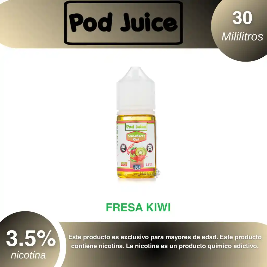 Pod Juice Salt Strawberry Kiwi 3.5% PROHIBIDA LA VENTA A MENORES DE EDAD. ADVERTENCIA: ESTE PRODUCTO CONTIENE NICOTINA, LA NICOTINA ES UNA SUSTANCIA QUIMICA ADICTIVA Y NOCIVA PARA LA SALUD. Los líquidos para vapeo contienen: propilenglicol USP, glicerina USP, sabor artificial y nicotina. Este producto puede contener nicotina, una sustancia altamente adictiva que puede generar dependencia, posibles afectaciones arteriales, cardiacas, pulmonares y otras aun no identificadas. No se recomienda su uso a mujeres en embarazo, puede generar lesiones al feto. Mantener alejado de niños y mascotas. No ingerir, puede generar irritación y/o intoxicación. Por favor antes de consumir consulte a su médico posibles afectaciones o sensibilidad a alguno de sus componentes. Los componentes de este producto pueden aumentar la sensación de ansiedad En caso de notar alguna reacción adversa por favor suspenda su uso de manera inmediata. Siga las instrucciones en el envase. No alterar sus componentes. Adquiera sus productos en sitios de confianza No use productos piratas, alterados, o en los cuales no pueda comprobar su buena procedencia, Verifique la reputación del fabricante y distribuidor antes de adquirir cualquier producto Si no es usuario fumador o vapeador no se recomienda su uso bajo ninguna circunstancia Al usar este producto usted es consciente que este producto puede generar afectaciones a su salud, incluyendo aquellas que a la fecha de la compra no se han identificado y que pueden aparecer a largo plazo