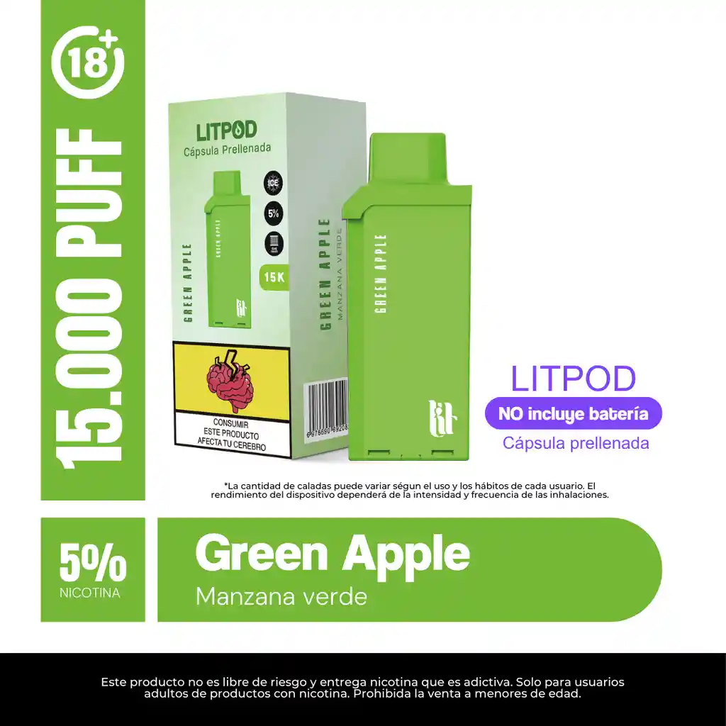 Pod Desechable marca Lit sabor a Green Apple. Fuerza de nicotina: 5%. Sal de nicotina equivalente a aproximadamente 1 paquete de cigarrillos. NO INCLUYE BATERÍA. Prohibida la venta a menores de edad. Producto nocivo para la salud que contiene nicotina, sustancia altamente adictiva. Antes de consumir consulte las indicaciones y contraindicaciones de uso.