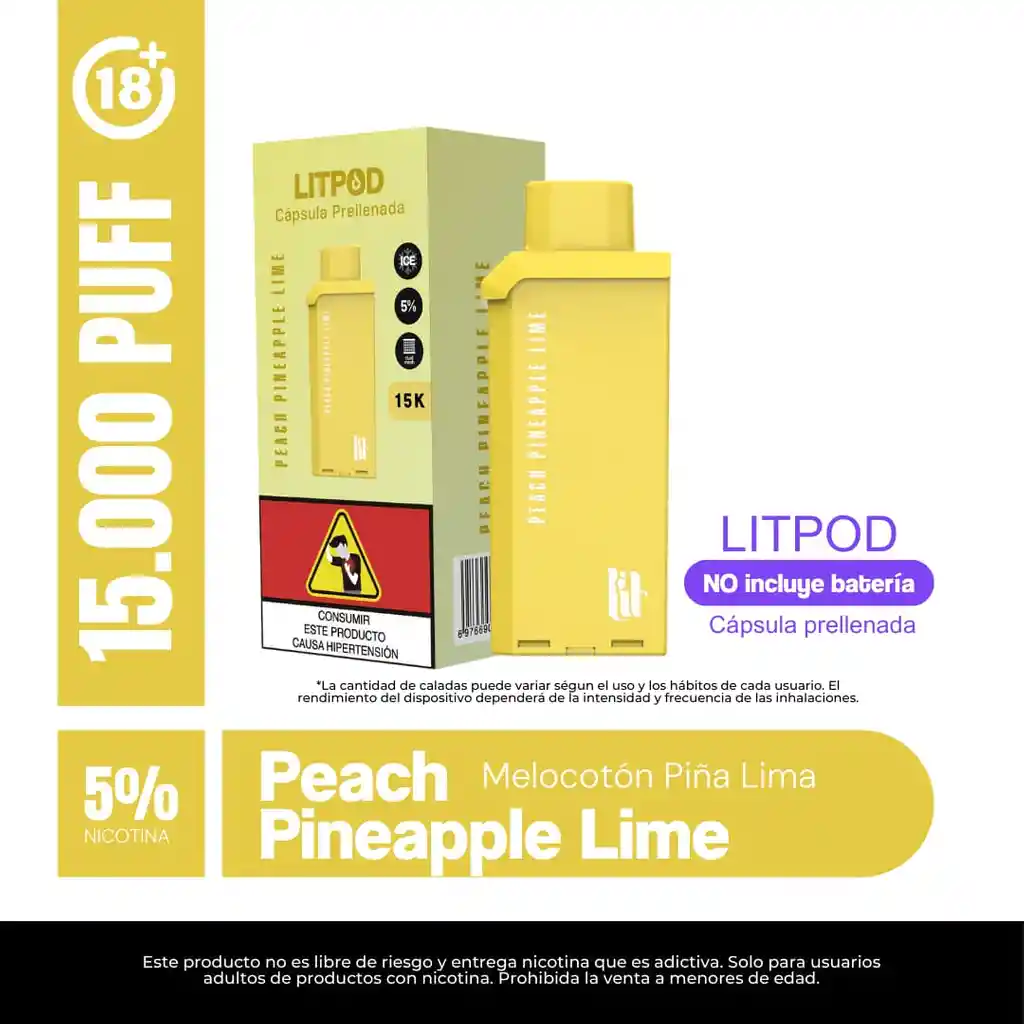 NO INCLUYE BATERIA SABOR DURAZNO PIÑA Y LIMA. Pod/recarga de 15.000 puffs marca LIT. El LIT POD 15.000 Puffs es el nuevo sistema de PODS de la marca LIT. Recarga de 15.000 puffs para tu bateria LIT. Producto exclusivo para mayores de edad.