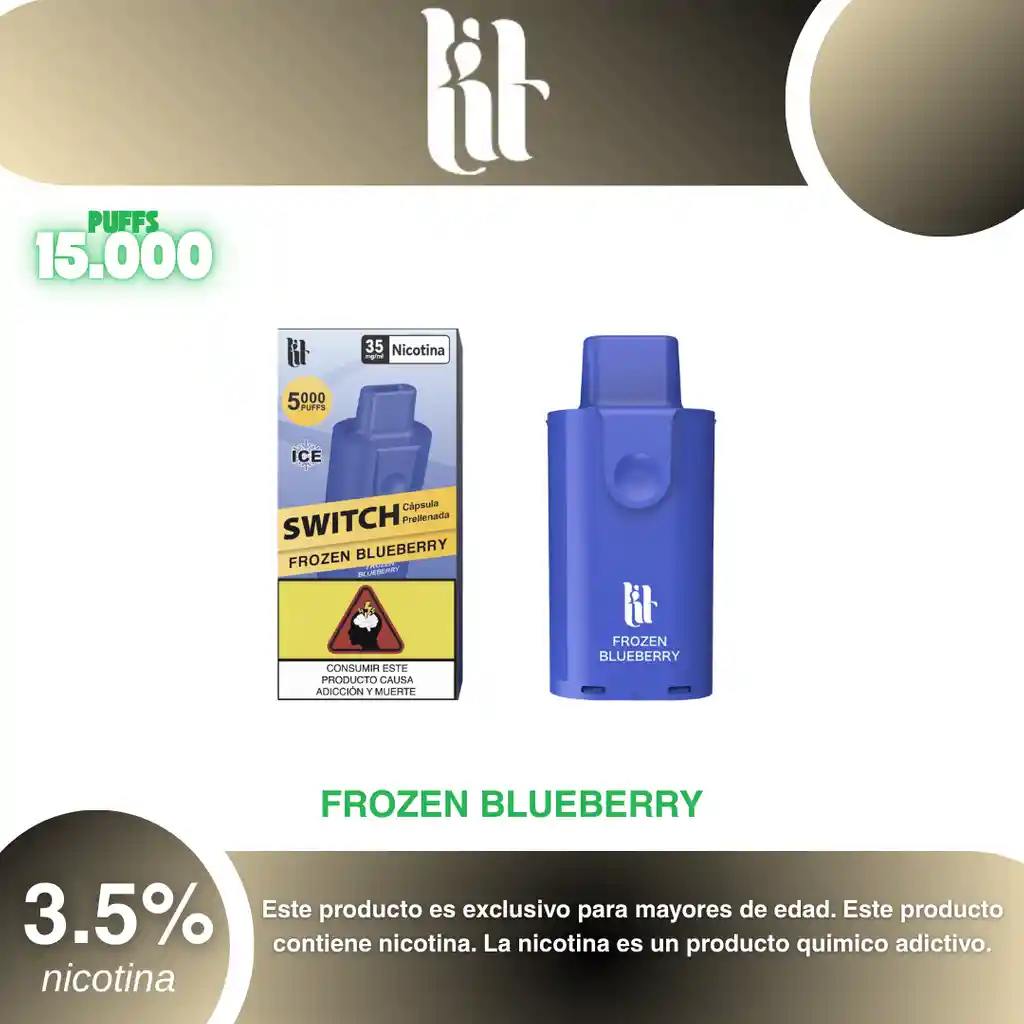 Pod Lit Switch 5.000 Puffs Sabor Arandano Mentolado 3.5% PROHIBIDA LA VENTA A MENORES DE EDAD. ADVERTENCIA: ESTE PRODUCTO CONTIENE NICOTINA, LA NICOTINA ES UNA SUSTANCIA QUIMICA ADICTIVA Y NOCIVA PARA LA SALUD. Los líquidos para vapeo contienen: propilenglicol USP, glicerina USP, sabor artificial y nicotina. Este producto puede contener nicotina, una sustancia altamente adictiva que puede generar dependencia, posibles afectaciones arteriales, cardiacas, pulmonares y otras aun no identificadas. No se recomienda su uso a mujeres en embarazo, puede generar lesiones al feto. Mantener alejado de niños y mascotas. No ingerir, puede generar irritación y/o intoxicación. Por favor antes de consumir consulte a su médico posibles afectaciones o sensibilidad a alguno de sus componentes. Los componentes de este producto pueden aumentar la sensación de ansiedad En caso de notar alguna reacción adversa por favor suspenda su uso de manera inmediata. Siga las instrucciones en el envase. No alterar sus componentes. Adquiera sus productos en sitios de confianza No use productos piratas, alterados, o en los cuales no pueda comprobar su buena procedencia, Verifique la reputación del fabricante y distribuidor antes de adquirir cualquier producto Si no es usuario fumador o vapeador no se recomienda su uso bajo ninguna circunstancia Al usar este producto usted es consciente que este producto puede generar afectaciones a su salud, incluyendo aquellas que a la fecha de la compra no se han identificado y que pueden aparecer a largo plazo