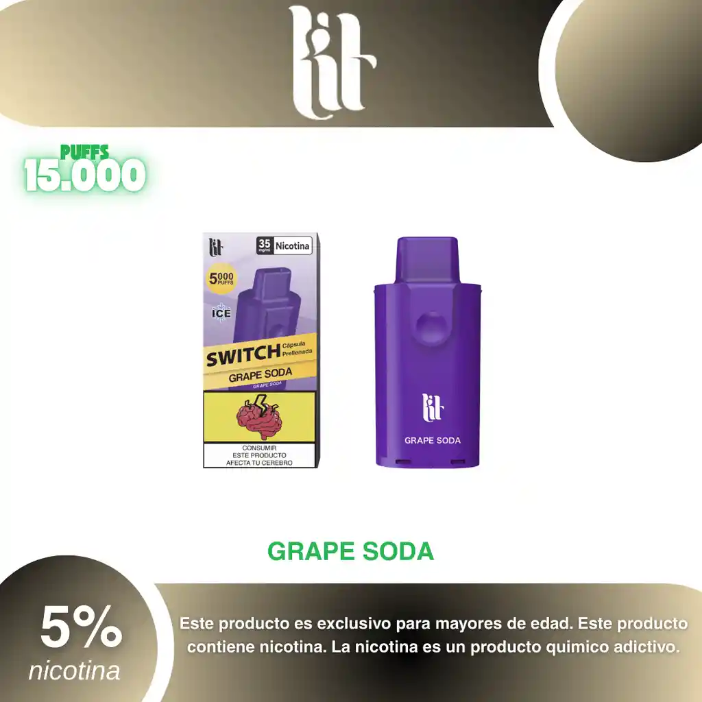 Pod Lit Switch 5.000 Puffs, Grape Soda 5% PROHIBIDA LA VENTA A MENORES DE EDAD. ADVERTENCIA: ESTE PRODUCTO CONTIENE NICOTINA, LA NICOTINA ES UNA SUSTANCIA QUIMICA ADICTIVA Y NOCIVA PARA LA SALUD. Los líquidos para vapeo contienen: propilenglicol USP, glicerina USP, sabor artificial y nicotina. Este producto puede contener nicotina, una sustancia altamente adictiva que puede generar dependencia, posibles afectaciones arteriales, cardiacas, pulmonares y otras aun no identificadas. No se recomienda su uso a mujeres en embarazo, puede generar lesiones al feto. Mantener alejado de niños y mascotas. No ingerir, puede generar irritación y/o intoxicación. Por favor antes de consumir consulte a su médico posibles afectaciones o sensibilidad a alguno de sus componentes. Los componentes de este producto pueden aumentar la sensación de ansiedad En caso de notar alguna reacción adversa por favor suspenda su uso de manera inmediata. Siga las instrucciones en el envase. No alterar sus componentes. Adquiera sus productos en sitios de confianza No use productos piratas, alterados, o en los cuales no pueda comprobar su buena procedencia, Verifique la reputación del fabricante y distribuidor antes de adquirir cualquier producto Si no es usuario fumador o vapeador no se recomienda su uso bajo ninguna circunstancia Al usar este producto usted es consciente que este producto puede generar afectaciones a su salud, incluyendo aquellas que a la fecha de la compra no se han identificado y que pueden aparecer a largo plazo