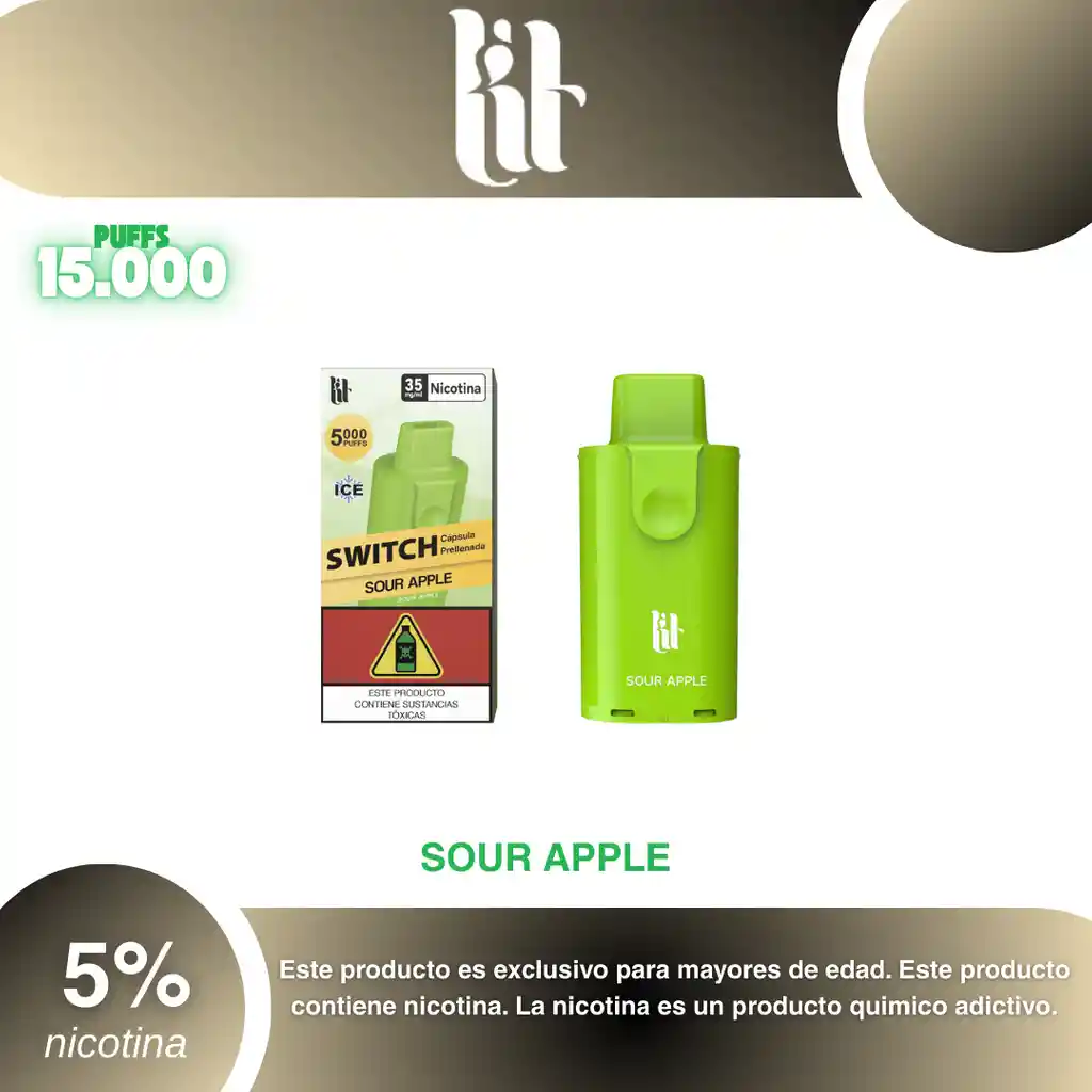 Pod Lit Switch 5.000 Puffs Sabor Manzana Verde 5% PROHIBIDA LA VENTA A MENORES DE EDAD. ADVERTENCIA: ESTE PRODUCTO CONTIENE NICOTINA, LA NICOTINA ES UNA SUSTANCIA QUIMICA ADICTIVA Y NOCIVA PARA LA SALUD. Los líquidos para vapeo contienen: propilenglicol USP, glicerina USP, sabor artificial y nicotina. Este producto puede contener nicotina, una sustancia altamente adictiva que puede generar dependencia, posibles afectaciones arteriales, cardiacas, pulmonares y otras aun no identificadas. No se recomienda su uso a mujeres en embarazo, puede generar lesiones al feto. Mantener alejado de niños y mascotas. No ingerir, puede generar irritación y/o intoxicación. Por favor antes de consumir consulte a su médico posibles afectaciones o sensibilidad a alguno de sus componentes. Los componentes de este producto pueden aumentar la sensación de ansiedad En caso de notar alguna reacción adversa por favor suspenda su uso de manera inmediata. Siga las instrucciones en el envase. No alterar sus componentes. Adquiera sus productos en sitios de confianza No use productos piratas, alterados, o en los cuales no pueda comprobar su buena procedencia, Verifique la reputación del fabricante y distribuidor antes de adquirir cualquier producto Si no es usuario fumador o vapeador no se recomienda su uso bajo ninguna circunstancia Al usar este producto usted es consciente que este producto puede generar afectaciones a su salud, incluyendo aquellas que a la fecha de la compra no se han identificado y que pueden aparecer a largo plazo