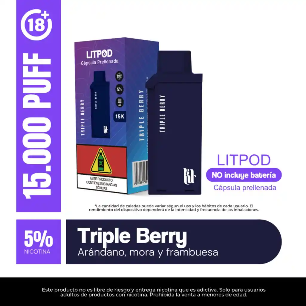 NO INCLUYE BATERIA SABOR TRIPLE BERRY. Pod/recarga de 15.000 puffs marca LIT. El LIT POD 15.000 Puffs es el nuevo sistema de PODS de la marca LIT. Recarga de 15.000 puffs para tu bateria LIT. Producto exclusivo para mayores de edad.