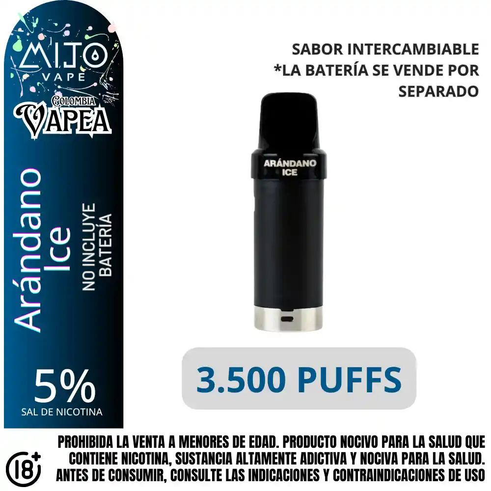 Pod Desechable marca Mijo sabor a Arandano Ice. Fuerza de nicotina: 5%. Sal de nicotina equivalente a aproximadamente 1 paquete de cigarrillos. NO INCLUYE BATERÍA. Prohibida la venta a menores de edad. Producto nocivo para la salud que contiene nicotina, sustancia altamente adictiva. Antes de consumir consulte las indicaciones y contraindicaciones de uso.
