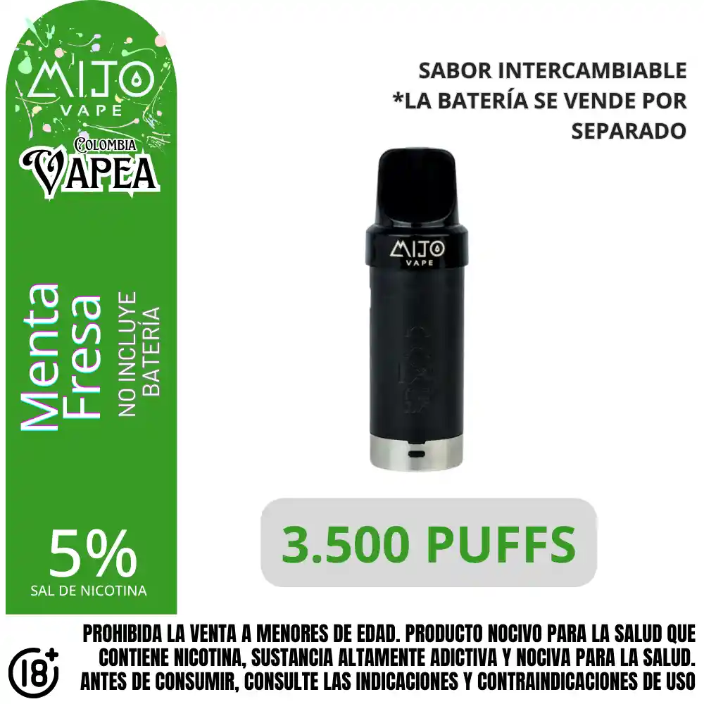 Pod Desechable marca Mijo sabor a Menta Fresca. Fuerza de nicotina: 5%. Sal de nicotina equivalente a aproximadamente 1 paquete de cigarrillos. NO INCLUYE BATERÍA. Prohibida la venta a menores de edad. Producto nocivo para la salud que contiene nicotina, sustancia altamente adictiva. Antes de consumir consulte las indicaciones y contraindicaciones de uso.