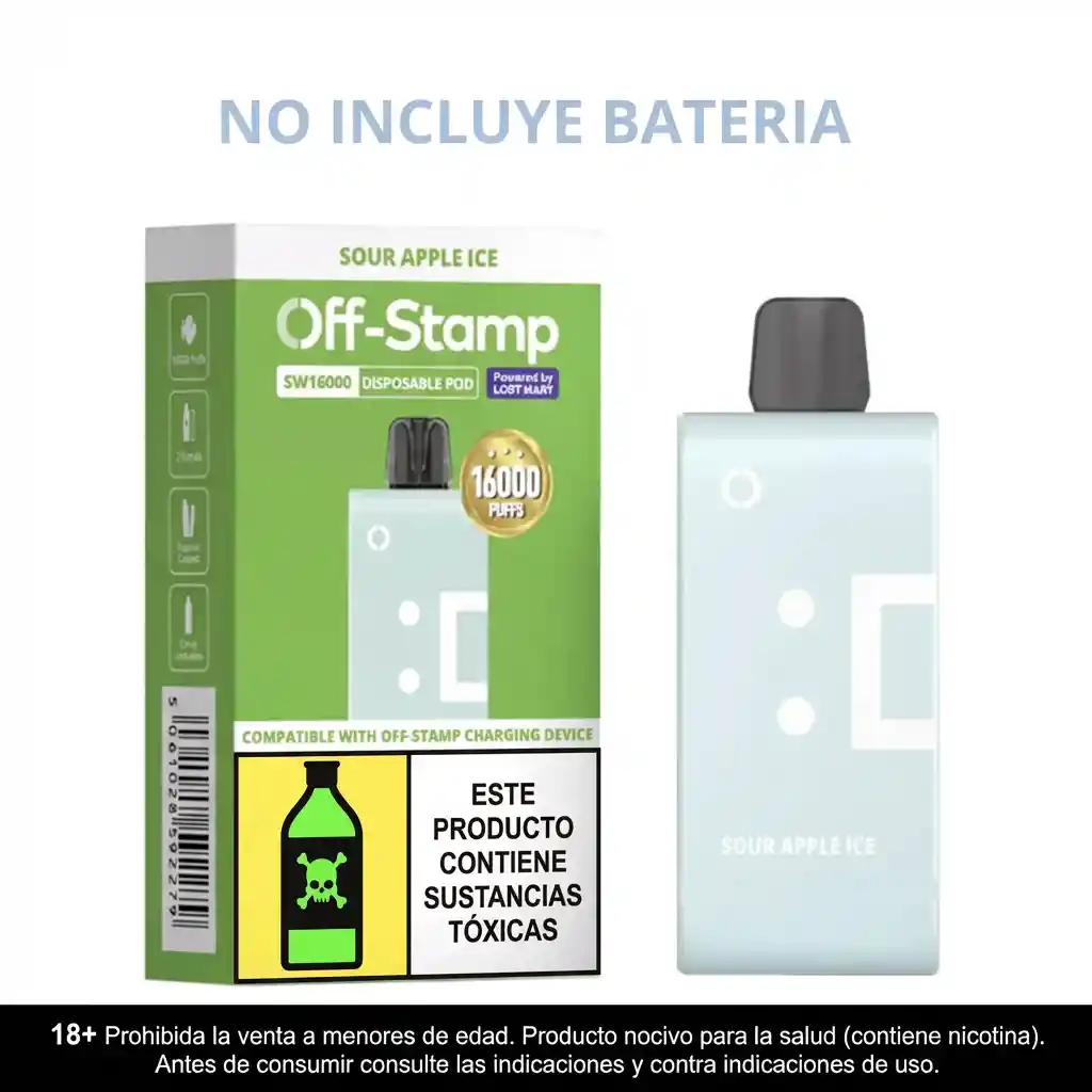 NO INCLUYE BATERIA SABOR MANZANA VERDE. Pod/recarga de 16.000 puffs marca OFF STAMP. El Pod Off Stamp 16.000 Puffs es el nuevo sistema de PODS de la marca OFF STAMP. Recarga de 16.000 puffs para tu bateria OFF STAMP. Producto exclusivo para mayores de edad. 5% Nicotina.
