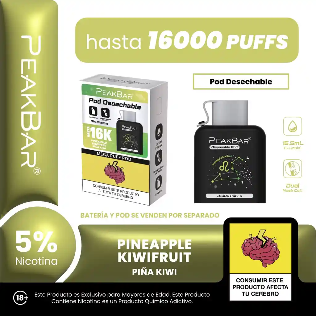 Pod de repuesto compatible con sistema semidesechable Peak Bar. No incluye batería. Sabor piña kiwi con rendimiento prolongado. Garantía por defectos de fábrica según normativa SIC.