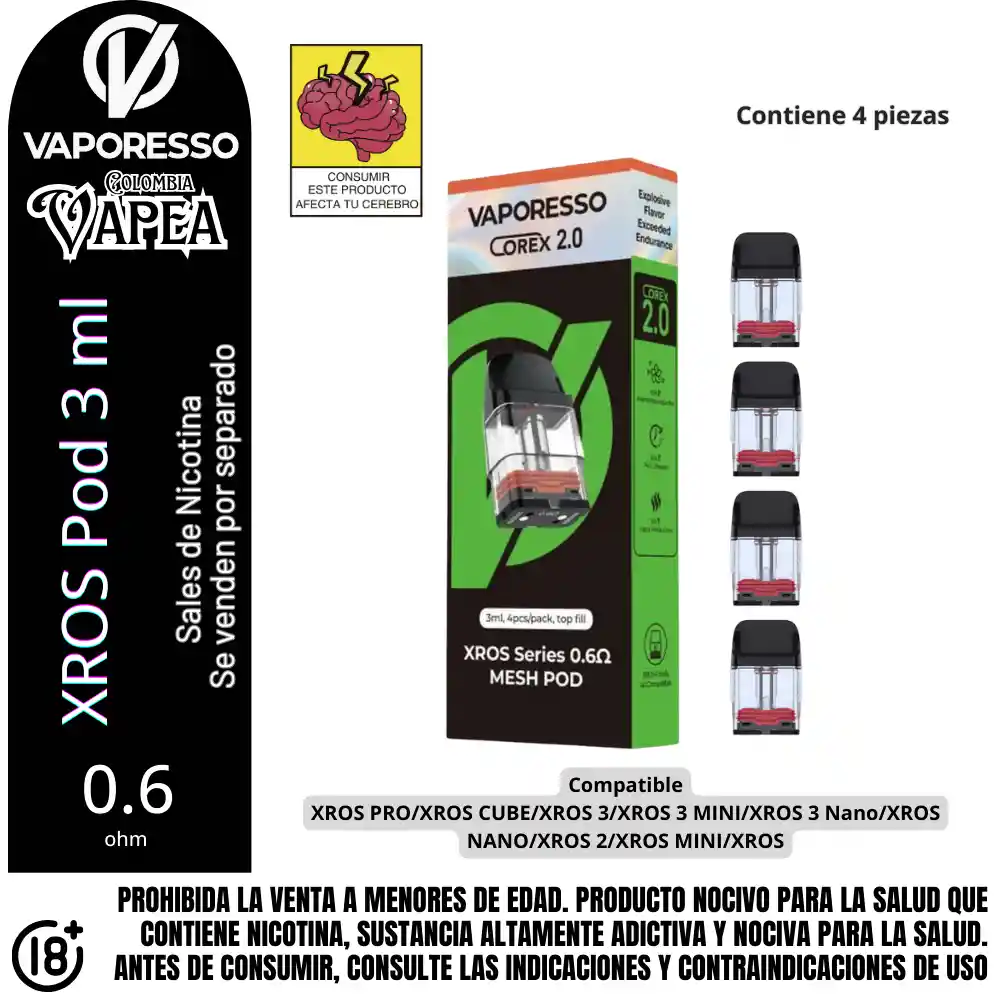 Cartucho de repuesto VAPORESSO XROS – 4PK que tiene una tecnología de calentamiento COREX y un relleno superior de Clamshell para aliviar la recarga de e-juice. Este cartucho XROS Pod está disponible en opciones de resistencia de 0,6 ohmios, con una capacidad variada de liquido de 2 ml o 3 ml . La cápsula de reemplazo Vaporesso Xros funciona idealmente con la cápsula de la serie Vaporesso Xros. Contiene 4 unidades en este kit de reemplazo. Prohibida la venta a menores de edad. Producto nocivo para la salud que contiene nicotina, sustancia altamente adictiva. Antes de consumir consulte las indicaciones y contraindicaciones de uso.
