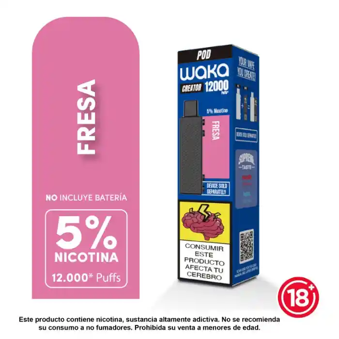 Especificaciones: -Puffs : 12,000 puffs -Nicotina: 5% - 50mg **Atención: Producto exclusivo para mayores de 18 años. Este producto no es libre de riesgo, en virtud de sus componentes es nocivo para la salud. Contiene nicotina, sustancia adictiva. manténgase fuera del alcance de los ninos. Consulte las indicaciones y contraindicaciones de uso.