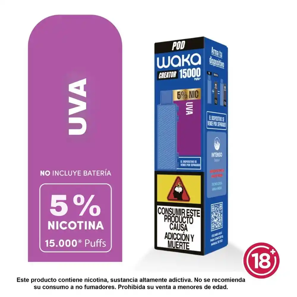 Pod Desechable marca Waka sabor a Uva. Fuerza de nicotina: 5%. Sal de nicotina equivalente a aproximadamente 1 paquete de cigarrillos. NO INCLUYE BATERÍA. Prohibida la venta a menores de edad. Producto nocivo para la salud que contiene nicotina, sustancia altamente adictiva. Antes de consumir consulte las indicaciones y contraindicaciones de uso.