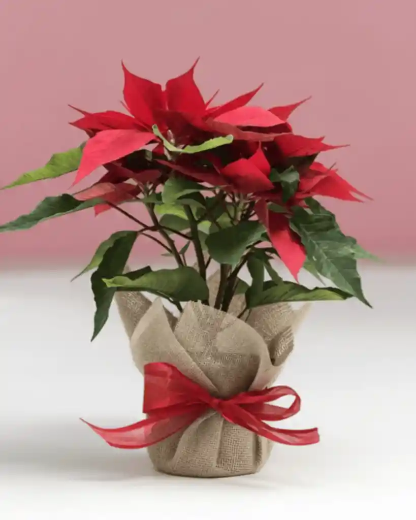 Poinsettia Roja en Maceta –Flor de Pascua La clásica Flor de Pascua, ahora en una presentación pensada para regalar y iluminar los espacios con el encanto cálido de la Navidad. Cada planta ha sido cultivada en invernaderos tecnificados y seleccionada por la armonía de sus brácteas y su porte equilibrado: una pieza viva que irradia color, tradición y elegancia. Características • Planta de 1 esqueje con 2 inflorescencias • Altura aproximada: 22 cm • Color: Rojo intenso • Sembrada en una maceta decorativa de 8 cm de alto x 10 cm de diámetro superior • Incluye ruana decorativa y tarjeta personalizada • Producto de temporada, disponible hasta agotar inventario Esta poinsettia es ideal para regalos corporativos, detalles de agradecimiento, decoración navideña en casa o para acompañar momentos especiales durante la temporada. Contiene Poinsettia roja (Flor de Pascua) Maceta decorativa Ruana navideña Tarjeta para dedicatoria personalizada