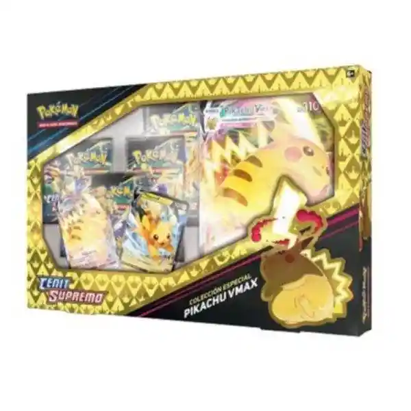 Prepárate para una tormenta de rayos de proporciones Gigamax! de Pikachu Cenit Supremo. Pikachu VMAX genera Energía con su Carga de Cola para, acto seguido, lanzar un enorme ataque Gigatrueno. Además, también encontrarás a Pikachu V para que puedas poner a Pikachu VMAX en juego a la velocidad del rayo. Y no te olvides de la carta de gran tamaño de Pikachu VMAX que podrás llevar donde quieras. Idioma: Español Contenido: 1 Carta holográfica grabada en relieve de Pikachu VMAX -1 Carta holográfica de Pikachu V - 1 Carta de gran tamaño de Pikachu VMAX - 5 Sobres Cenit Supremo - 1 Carta con código para canjear en línea