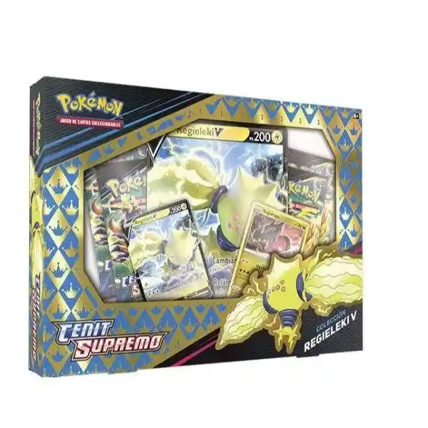 ¡Dos Pokémon legendarios previamente desconocidos han despertado en la tundra helada! Descubre el poder de Regieleki de tipo Rayo o de Regidrago de tipo Dragón. Idioma: Español Contenido: 1 carta holográfica de Regieleki V - 1 carta holográfica de Regidrago - 1 carta holográfica de gran tamaño de Regieleki V - 4 Sobres de Cenit Supremo - 1 Carta con código para Pokémon Live
