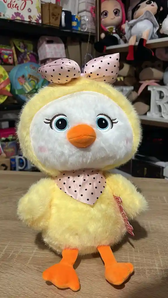 Peluche de pollito color amarillo pastel con textura muy suave. Destaca por sus accesorios en color rosa con puntos negros (polka dots): un lazo gigante en la cabeza y una pañoleta triangular al cuello. Felpa de pelo largo tipo soft cloud, detalles en tela satinada (lazo y pañoleta), ojos de seguridad con brillo y relleno de algodón siliconado ultra esponjoso