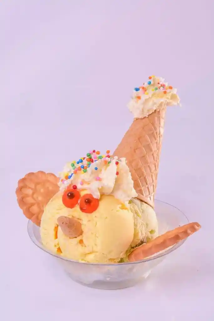 dos sabores de helado en forma de pollito, decorado con crema chantilly, galletas, chicles, grajeas de colores y barquillos.
