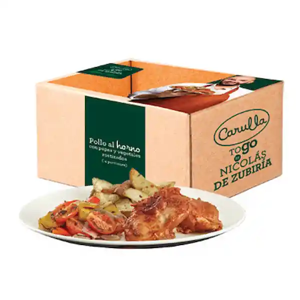 Contramuslos de Pollo al Horno Acompañados de Papas y Vegetales Rostizados; Para Dos Porciones Listo Para Calentar y Compartir. Caja