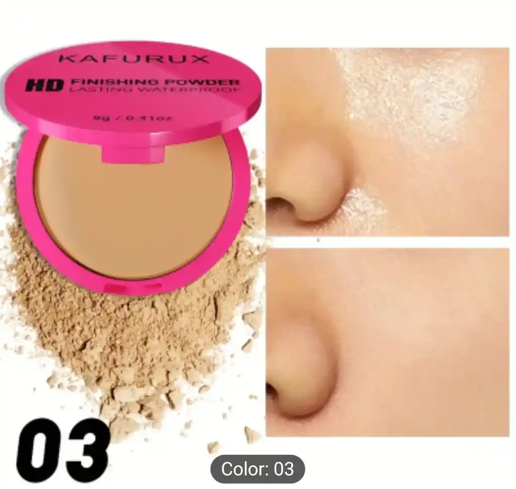 Base de maquillaje en polvo compacto, no pegajosa, resistente al agua, acabado mate, cobertura total, tonos beige claros, tonos claros a medios, aplicación fácil para un look natural, empaque elegante, fórmula no pegajosa