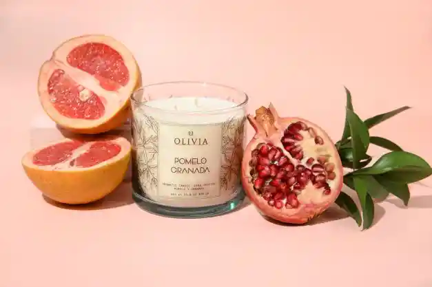 Vela aromática de cera vegetal - Peso: 450gr - Aroma: Pomelo Granada - Clasificación: Cítrico/Dulce - Intensidad aroma: Fuerte.