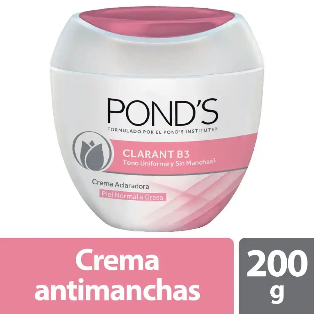 Crema antimanchas para un tono uniforme, suave y luminoso. La crema aclaradora y antimanchas Pond´s Clarant B3, piel normal a seca, restablece el tono natural de la piel hacia dentro, desvaneciendo manchas oscuras, logrando un tono uniforme y sin manchas por fuera con la ayuda de la fórmula avanzada con vitamina B3. Dermatológicamente probada.