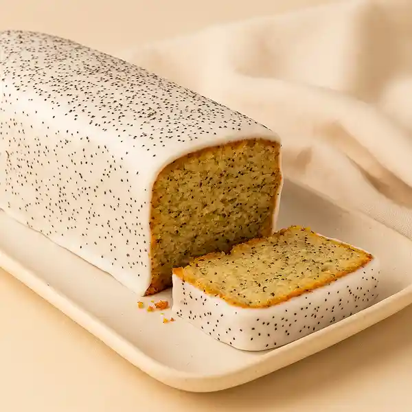 ponqué húmedo y aromático, bañado con vino blanco que realza su sabor único, infaltable las semillas de amapola y decorado con crema de vainilla que lo convierte en un porqué sofisticado y lleno de tradición.