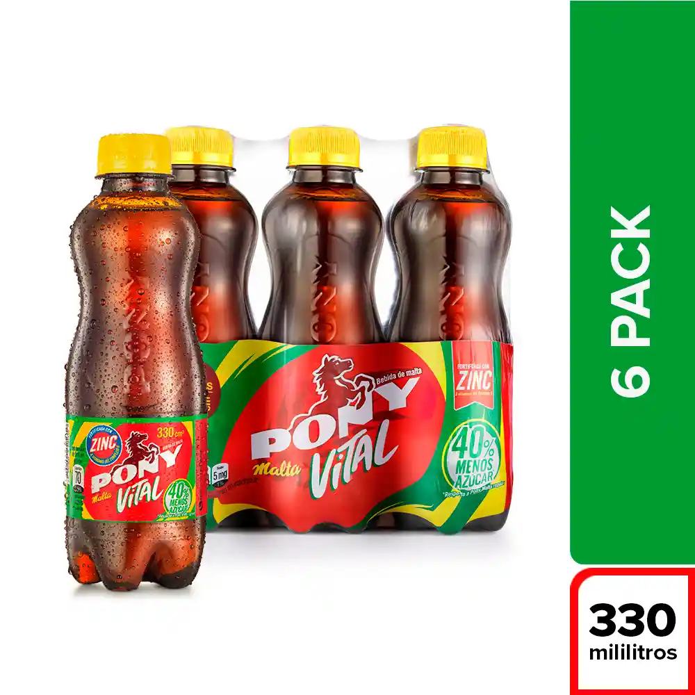 Pack Pony Contiene 6 Unidades de 330 mL c/u. Pony Malta Vital es la Nueva Malta Que Entra Para Amplificar Más el Portafolio de Maltas, Ofreciendo Otra Alternativa Para Los Consumidores Que Buscan Bebidas Más Nutritivas Pero Con Menos Azúcar. Pony Malta Vital es Una Bebida Hecha a Base de Malta Con Ingredientes Naturales, Fortificada Con Más Zinc (10%), Vitaminas Del Complejo B y 40% Menos Azúcar. Prohíbase el Expendio de Bebidas Embriagantes a Menores de Edad. Ley 124 1994. El Exceso de Alcohol es Perjudicial Para la Salud. Ley 30 de 1986.