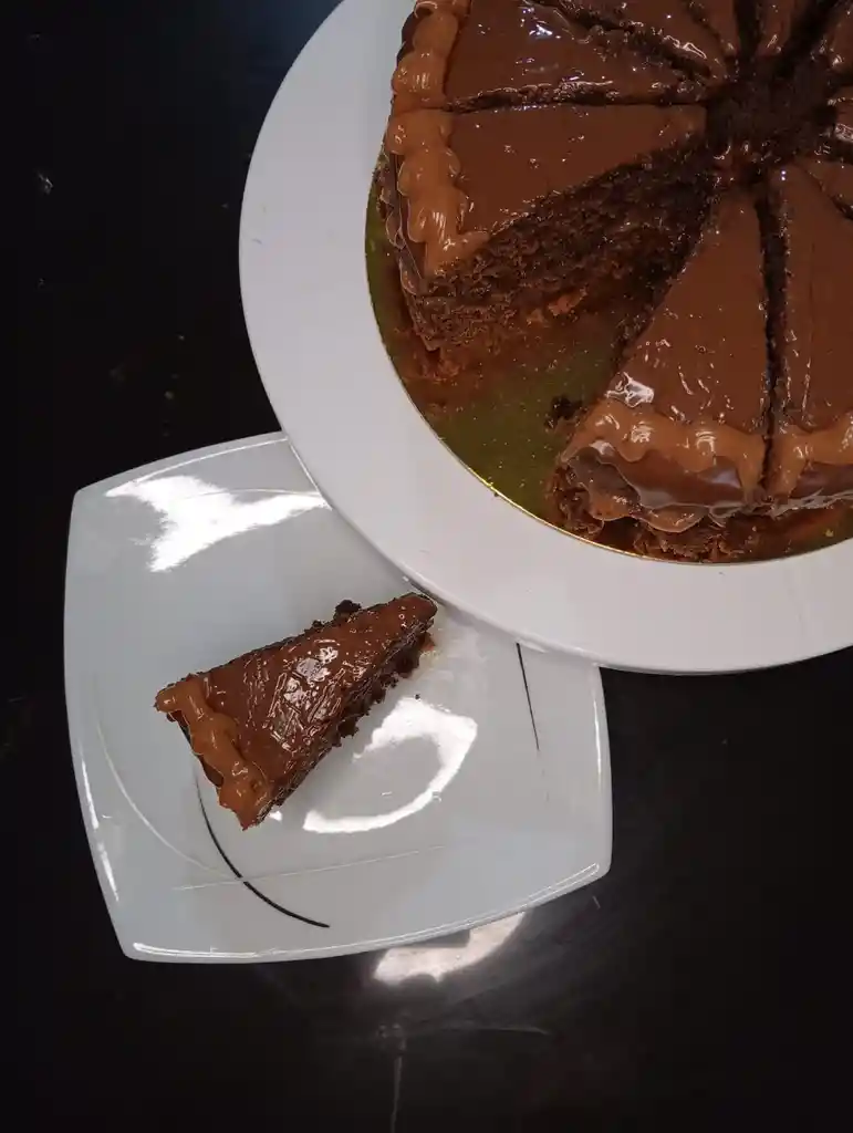 Deliciosa torta de chocolate con arequipe y cubierta de chocolate semi amargo