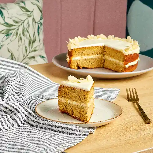 Torta suave de almendras y avena molida,frosting de yogurt griego, queso philadelphia y almendra fileteada.