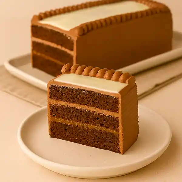 humedecido en vino, relleno con una irresistible combinación de crema de chocolate y arequipe, acompañado de trocitos de nuez que aportan textura y sabor. Decorado con una delicada cobertura de crema de chocolate que lo convierte en una experiencia única, intensa y sofisticada.