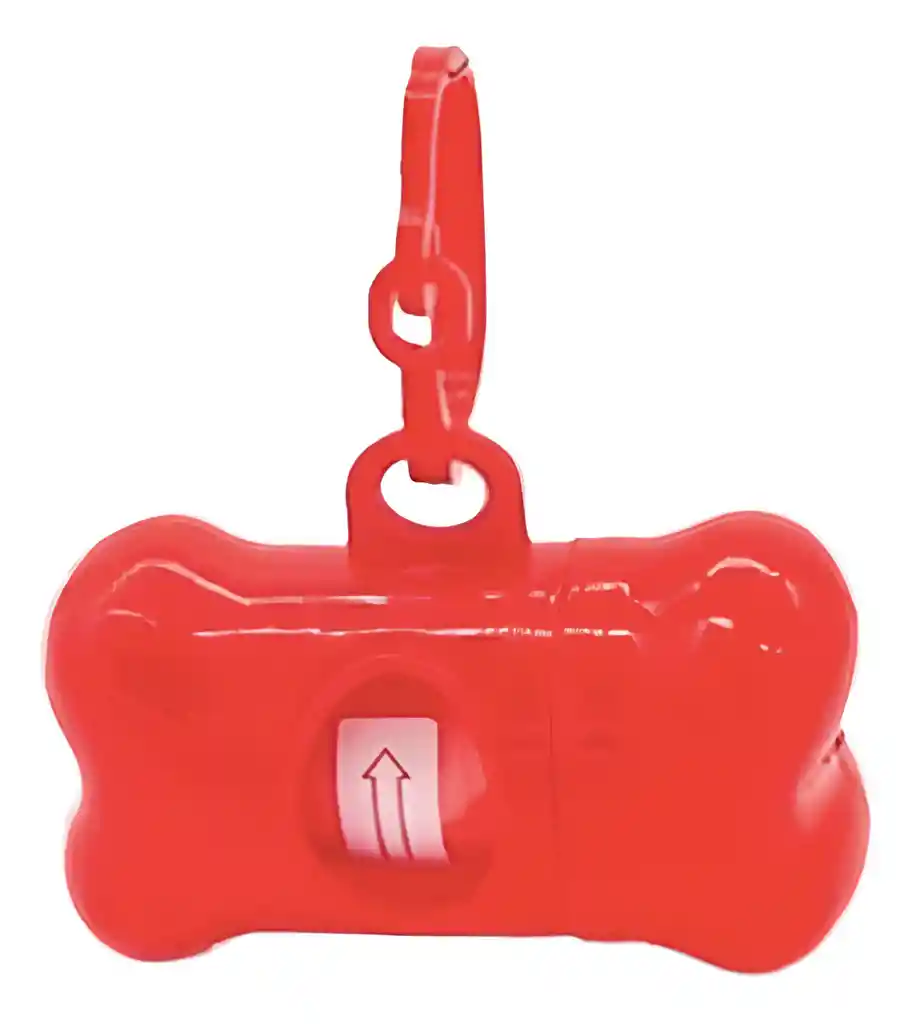America store te trae El Porta Bolsa Huesito Para Mascotas + Bolsa Porta bolsas con diseño de hueso, cuenta con un orificio en donde podrá guardar las bolsas higiénicas y gancho ideal para fijar al collar o arnés de su mascosta. Cuenta con rollo de repuesto. Material: Plástico Color: Rojo, azul, negro, Disponible para Razas pequeñas, medianas y grandes