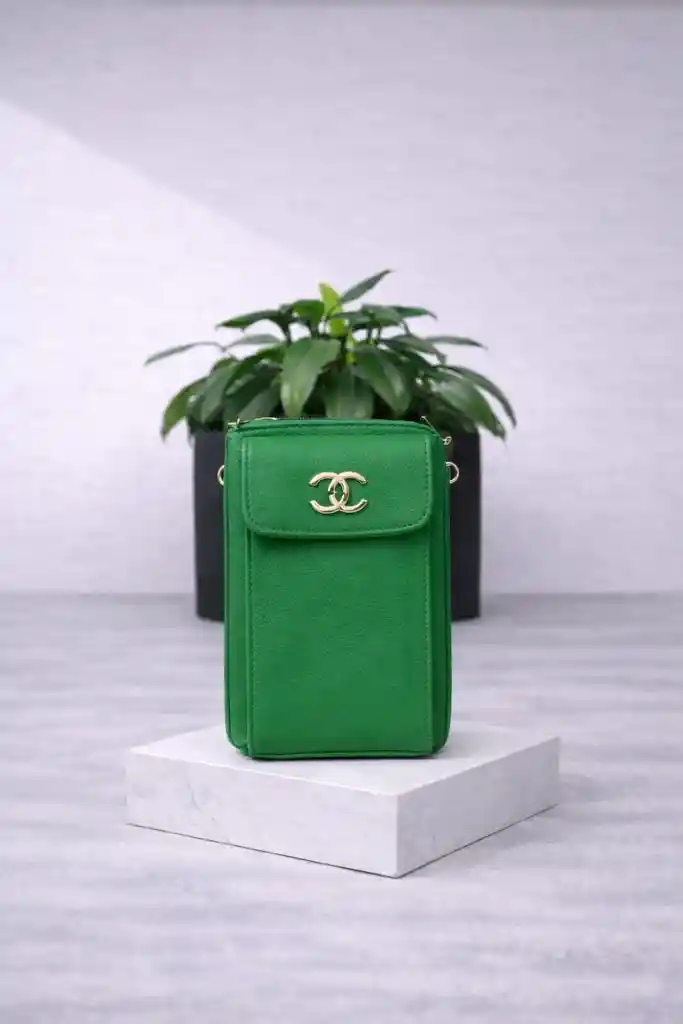 Porta celular tipo bandolera color verde, práctico y compacto. Cuenta con solapa frontal y espacio ideal para guardar tu celular y pequeños objetos personales. Incluye correa para llevarlo al hombro o cruzado en el cuerpo, perfecto para el uso diario
