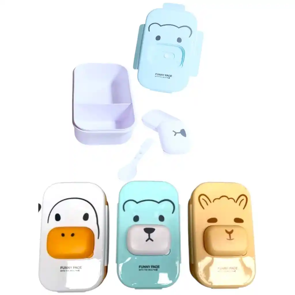 Lunch box de plástico con diseño de animales, práctico y ligero para transportar tus alimentos. Cuenta con 2 compartimientos internos que permiten organizar la comida sin que se mezcle, y tapa con seguro hermético que evita derrames. Incluye cuchara.