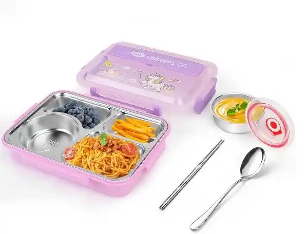 La lonchera para niños con 4 compartimientos y ensaladera es una solución innovadora y divertida para facilitar la alimentación de los más pequeños. Fabricada internamente en acero inoxidable 304, garantiza la máxima durabilidad, resistencia y seguridad alimentaria. Este material de alta calidad asegura que la lonchera sea libre de sustancias tóxicas, lo que la convierte en una opción confiable para el cuidado de la salud de tus hijos. Con un diseño encantador que presenta para niña, esta lonchera no solo cumple con su función práctica sino que también se convierte en un elemento atractivo para los niños. La presencia de estos diseños cautivadores fomenta el interés de los niños en la comida y hace que el momento de la comida sea más placentero y emocionante. Durabilidad y seguridad: Fabricada en acero inoxidable 304, garantiza resistencia a la corrosión y durabilidad a largo plazo. Además, el material es seguro para alimentos, asegurando la salud de tus hijos.
