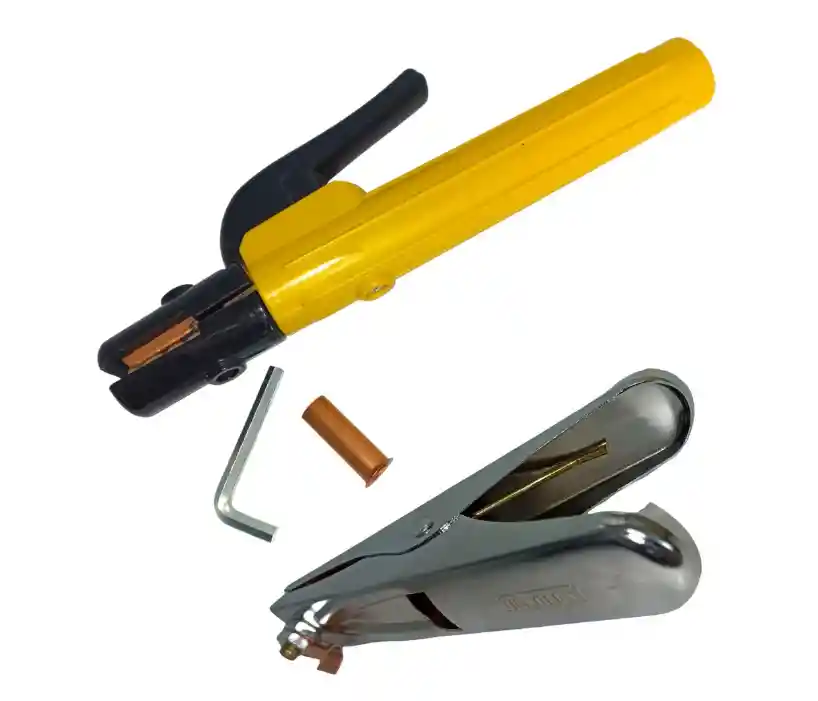 COMBO DE PORTA ELECTRODO + PINZA 500 AMPERIOS PARA SOLDADOR CARACTERÍSTICAS • Mordaza de laton para una excelente conductividad • Capacidad 500 amperios • Para electrodos desde 2.5 a 10 mm • Ciclo de trabajo 500 Amp a 60%, 600 Amp a 35% • Resistente al calor y aislada para mayor seguridad • Se puede utilizar en posiciones de 45, 90 o 180 grados • Marca UYUSTOOLS ADVETENCIA ° Siga correctamente las instrucciones para la adecuada instalación del cable. ° El cable debe estar bien sujeto para evitar un sobrecalentamiento del Porta Electrodo. ° No tocar directamente las partes conductoras del Porta Electrodo.