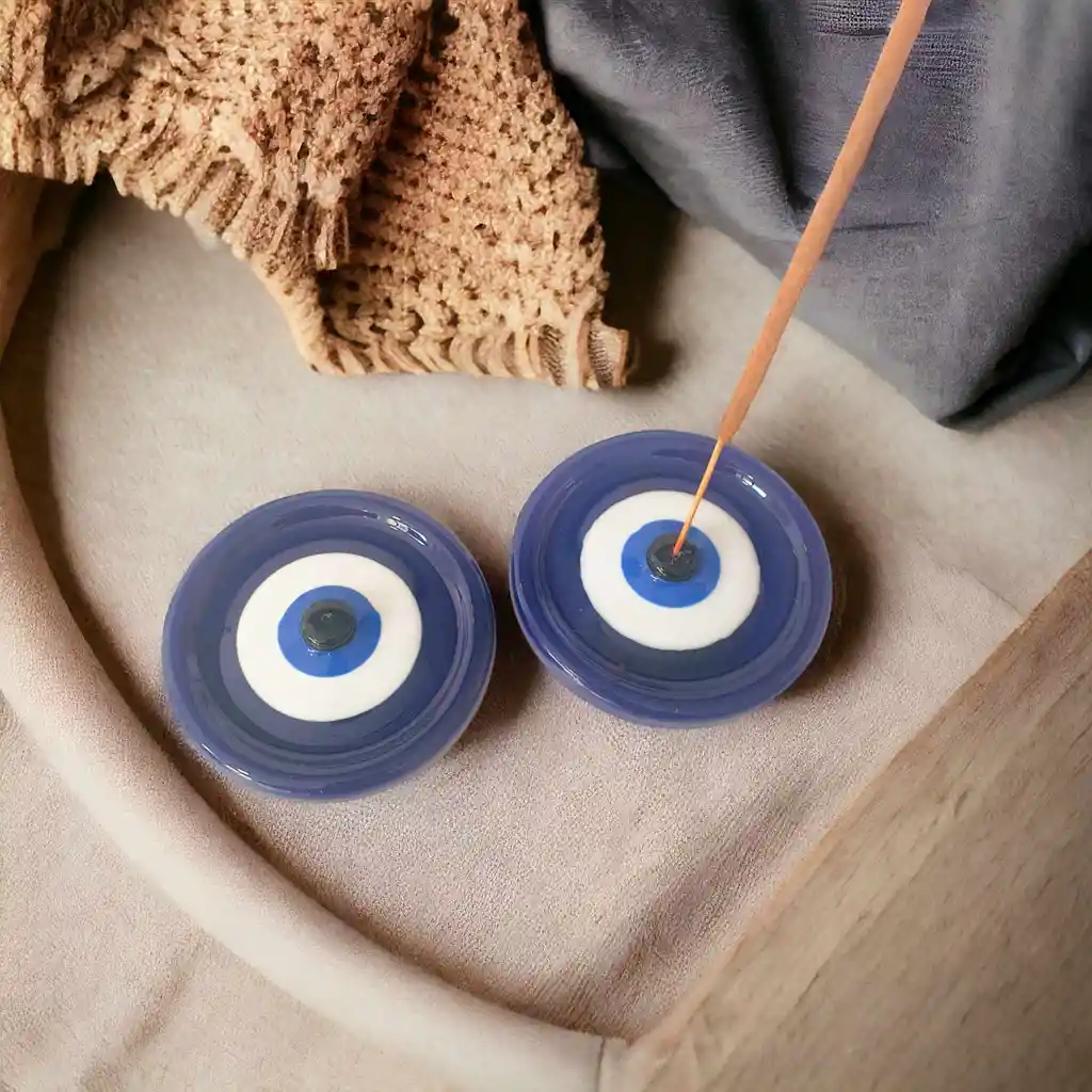 Porta incienso en acrilico en forma de ojo turco. Dimensiones: 8 cm diámetro Color: blanco, azul oscuro y negro.