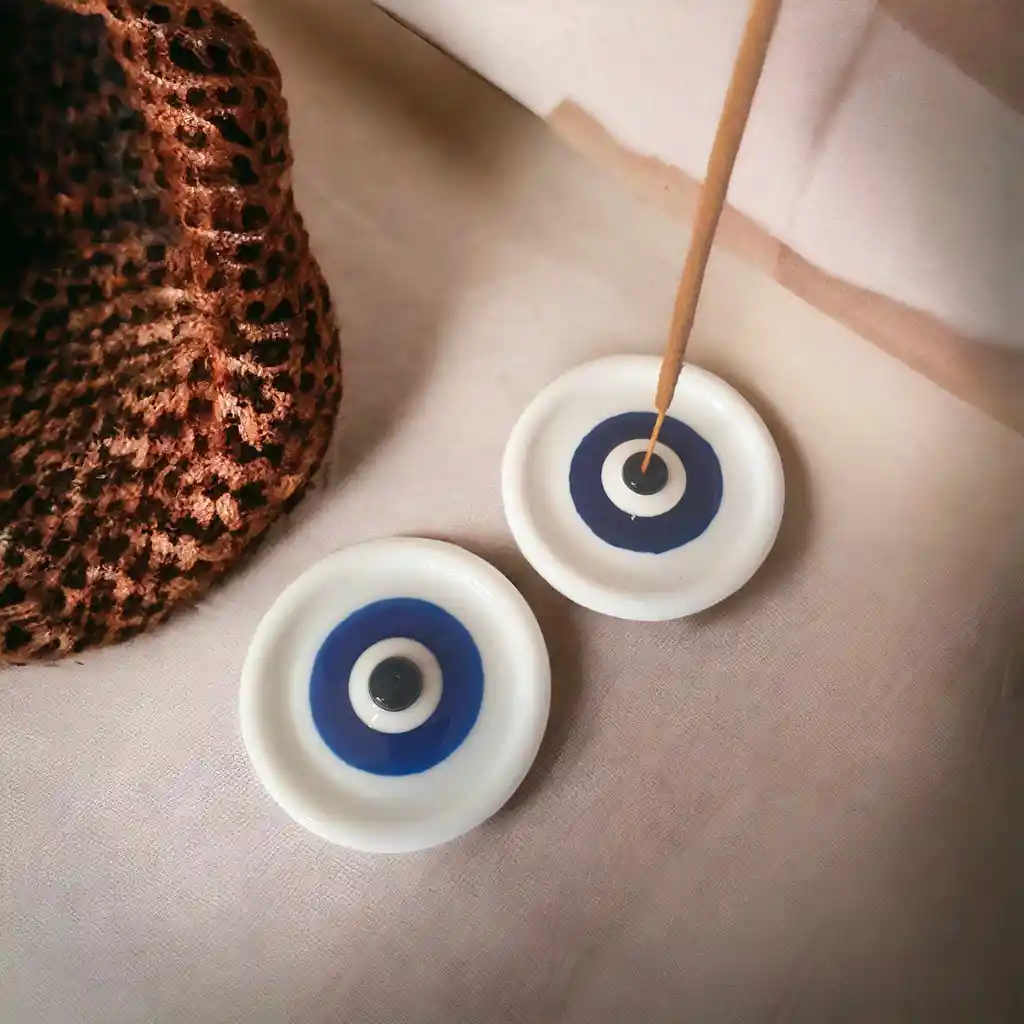 Porta incienso en acrilico en forma de ojo turco. Dimensiones: 8 cm diámetro Color: blanco, azul oscuro y negro.
