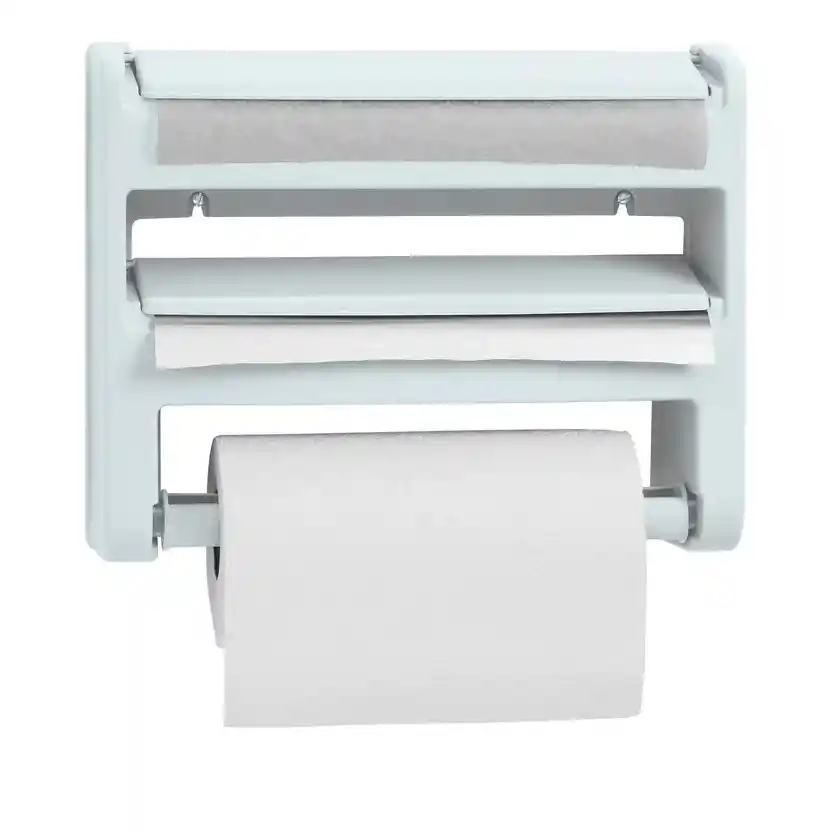 Organizador multifuncional diseñado para almacenar y dispensar papel aluminio, papel film, papel encerado y rollo de papel de cocina. Características - Sistema 4 en 1 compatible con papel aluminio, papel film, papel encerado y papel de cocina - Cuchillas internas integradas para un corte limpio y seguro - Diseño compacto y funcional - Mantiene los rollos organizados y protegidos